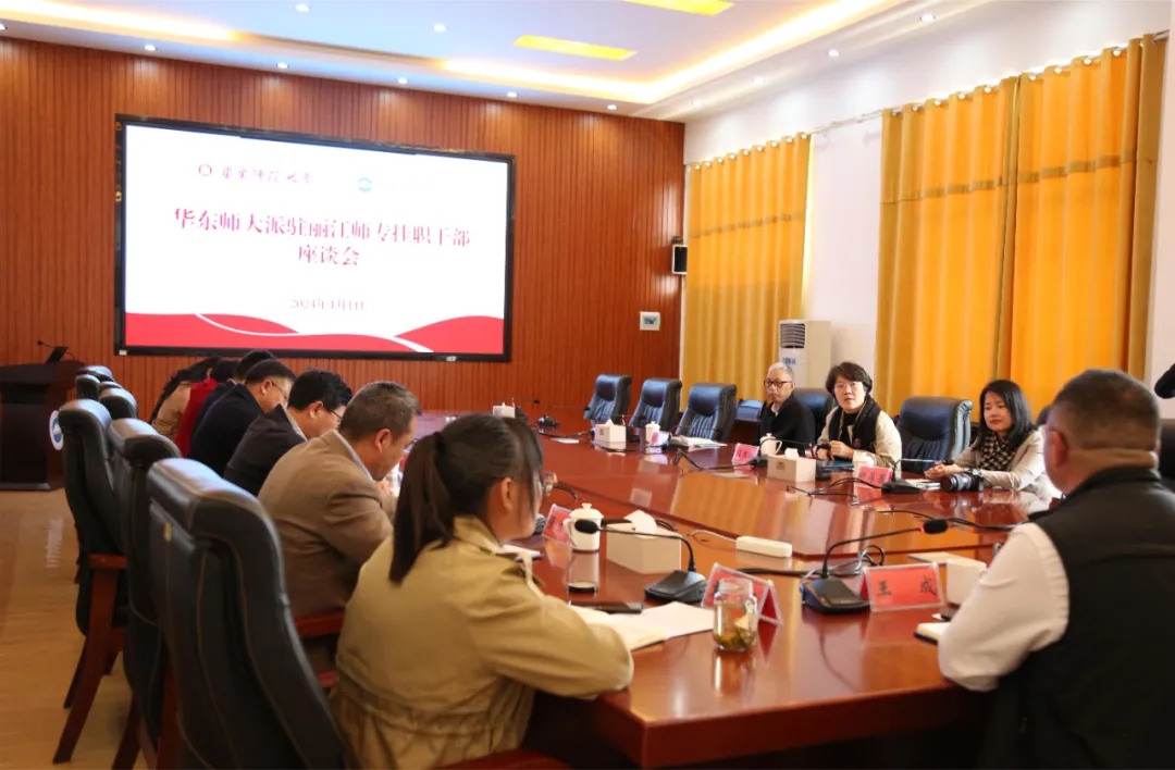 4月1日下午,学校在校务管理中心第三会议室召开华东师范大学派驻丽江师范高等专科学校挂职干部座谈会。华东师范大学教师发展学院(开放教育学院)院长闫寒冰教授、办公室副主任钟蓓蓓,我校领导班子成员,校长顾问、继续教育学院名誉院长冯大鸣教授出席会议。会议由我校党委书记毕天云主持。